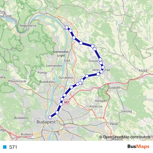 The first stop of the S71 rail route is Vác and the last stop is Budapest-Nyugati. S71 is operational during everyday.