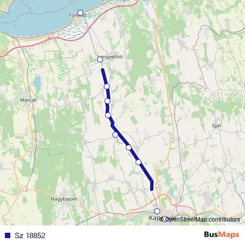 The first stop of the Sz 18852 rail route is Kaposvár and the last stop is Fonyód. Sz 18852 is operational during everyday.