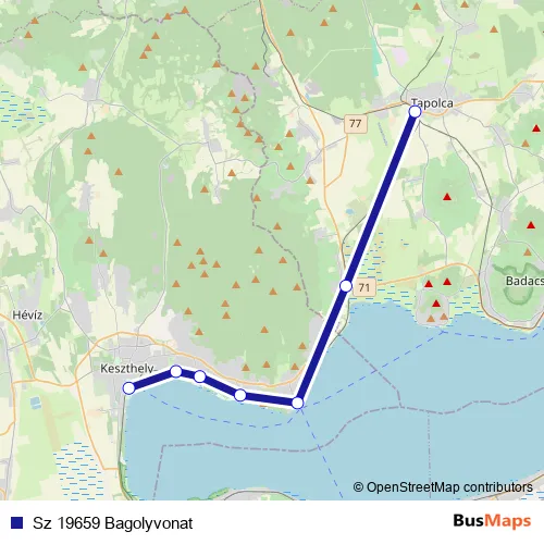 The first stop of the Sz 19659 Bagolyvonat rail route is Tapolca and the last stop is Keszthely. Sz 19659 Bagolyvonat (Sz 19659 Bagolyvonat) is operational during on weekends.