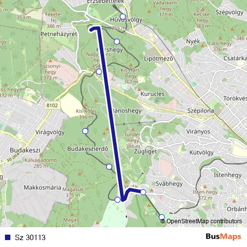 The first stop of the Sz 30113 rail route is Hűvösvölgy and the last stop is Széchenyihegy. Sz 30113 is operational during on weekends.