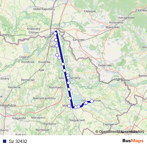 The first stop of the Sz 32432 rail route is Záhony and the last stop is Fehérgyarmat. Sz 32432 is operational during everyday.