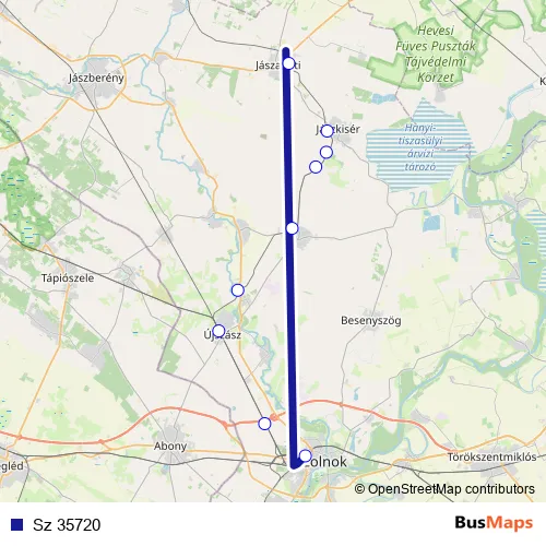 The first stop of the Sz 35720 rail route is Jászapáti and the last stop is Szolnok. Sz 35720 is operational during everyday.