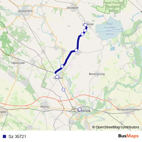 The first stop of the Sz 35721 rail route is Szolnok and the last stop is Jászkisér. Sz 35721 is operational during everyday.