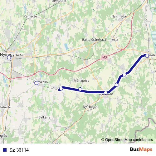 The first stop of the Sz 36114 rail route is Nyíregyháza and the last stop is Mátészalka. Sz 36114 is operational during everyday.