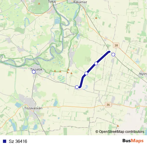 The first stop of the Sz 36416 rail route is Tiszalök and the last stop is Görögszállás. Sz 36416 is operational during everyday.