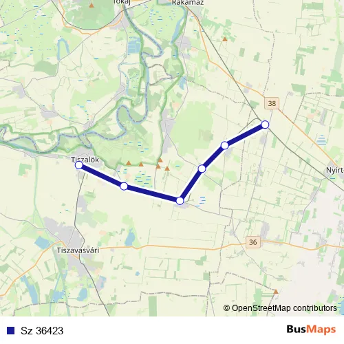 The first stop of the Sz 36423 rail route is Görögszállás and the last stop is Tiszalök. Sz 36423 is operational during everyday.