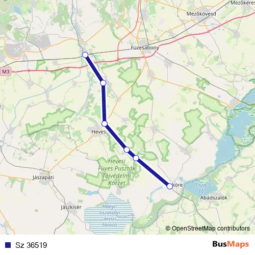 The first stop of the Sz 36519 rail route is Kisköre and the last stop is Kál-Kápolna. Sz 36519 is operational during everyday.