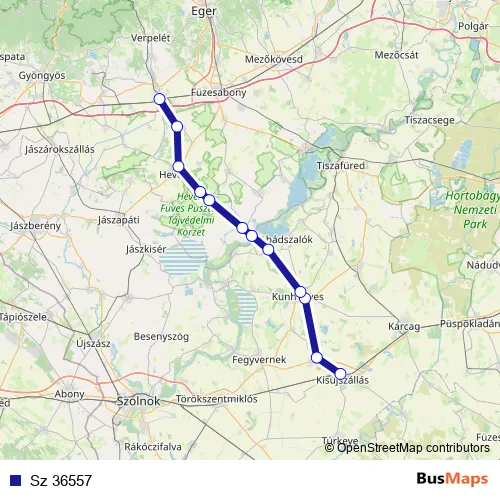 The first stop of the Sz 36557 rail route is Kisújszállás and the last stop is Kál-Kápolna. Sz 36557 is operational during on weekends.