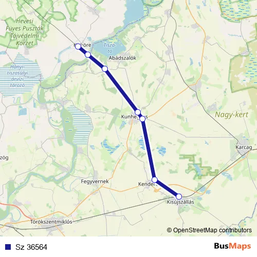 The first stop of the Sz 36564 rail route is Kisköre and the last stop is Kisújszállás. Sz 36564 is operational during everyday.