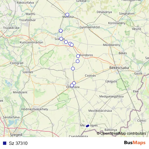 The first stop of the Sz 37310 rail route is Mezőtúr and the last stop is Orosháza. Sz 37310 is operational during everyday.