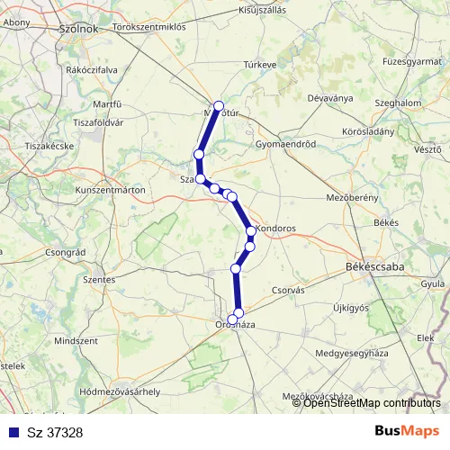 The first stop of the Sz 37328 rail route is Mezőtúr and the last stop is Orosháza. Sz 37328 is operational during everyday.