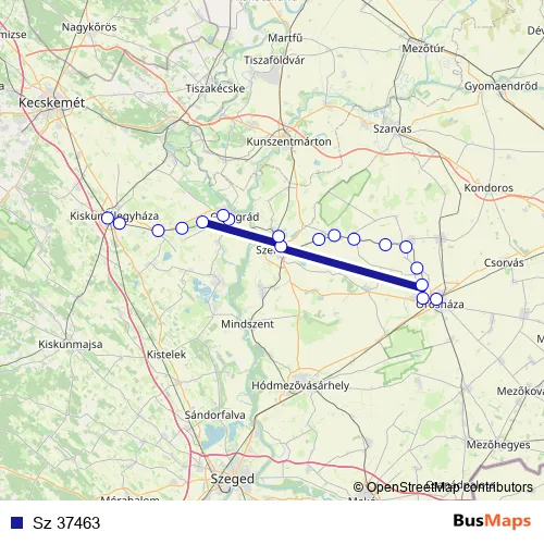 The first stop of the Sz 37463 rail route is Orosháza and the last stop is Kiskunfélegyháza. Sz 37463 is operational during on weekends.