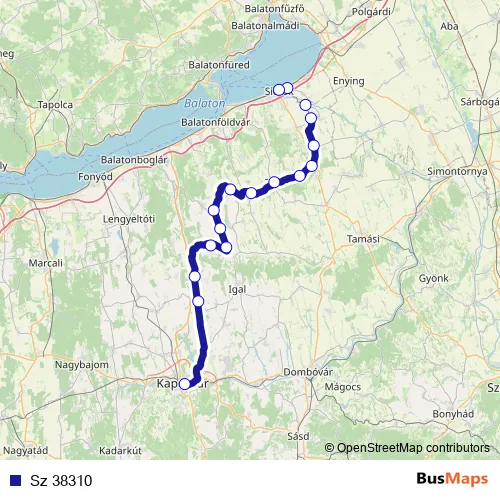 The first stop of the Sz 38310 rail route is Kaposvár and the last stop is Siófok. Sz 38310 is operational during everyday.