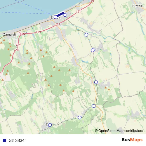 The first stop of the Sz 38341 rail route is Siófok and the last stop is Tab. Sz 38341 is operational during everyday.