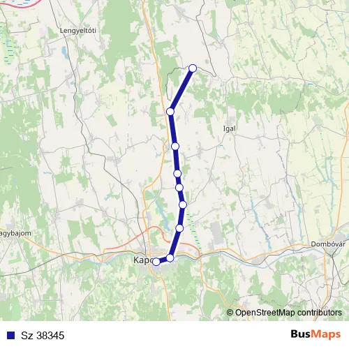 The first stop of the Sz 38345 rail route is Kisbárapáti and the last stop is Kaposvár. Sz 38345 is operational during everyday.