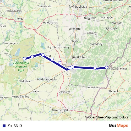 The first stop of the Sz 6613 rail route is Hortobágy and the last stop is Nyírábrány. Sz 6613 is operational during on weekdays.