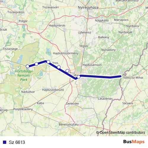 The first stop of the Sz 6613 rail route is Hortobágy and the last stop is Debrecen. Sz 6613 is operational during on weekdays.