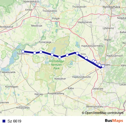 The first stop of the Sz 6619 rail route is Tiszafüred and the last stop is Debrecen. Sz 6619 is operational during everyday.