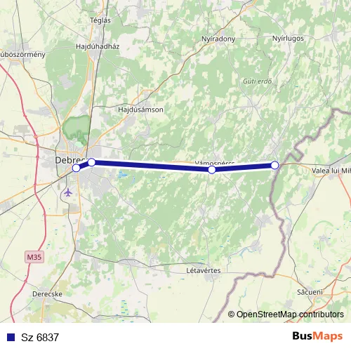 The first stop of the Sz 6837 rail route is Nyírábrány and the last stop is Debrecen. Sz 6837 is operational during on weekdays.