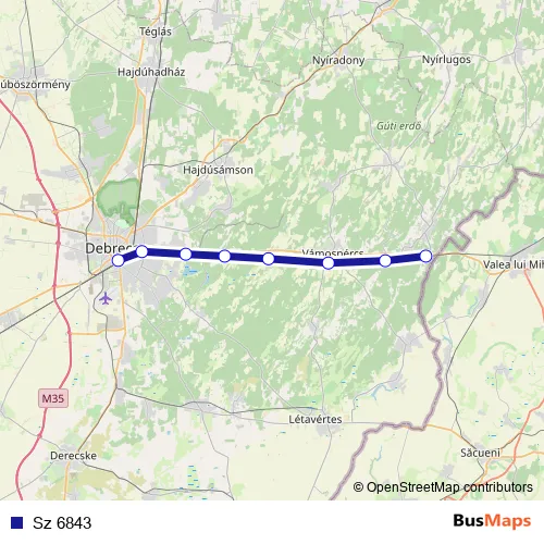The first stop of the Sz 6843 rail route is Nyírábrány and the last stop is Debrecen. Sz 6843 is operational during on weekdays.