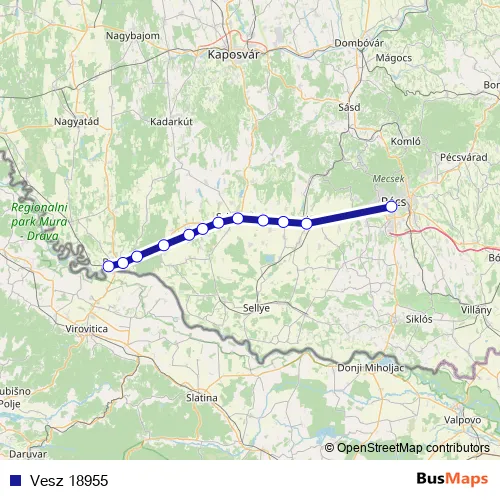 The first stop of the Vesz 18955 rail route is Pécs and the last stop is Barcs. Vesz 18955 is operational during everyday.