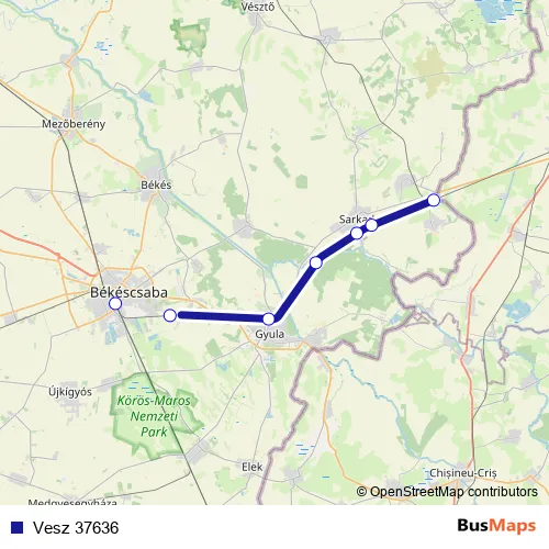 The first stop of the Vesz 37636 rail route is Békéscsaba and the last stop is Kötegyán. Vesz 37636 is operational during everyday.