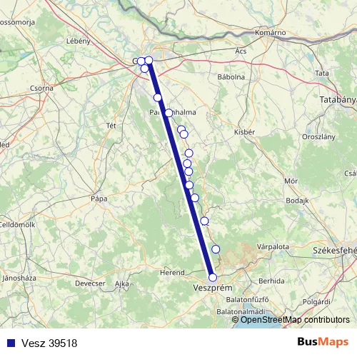 The first stop of the Vesz 39518 rail route is Győr and the last stop is Veszprém. Vesz 39518 is operational during everyday.