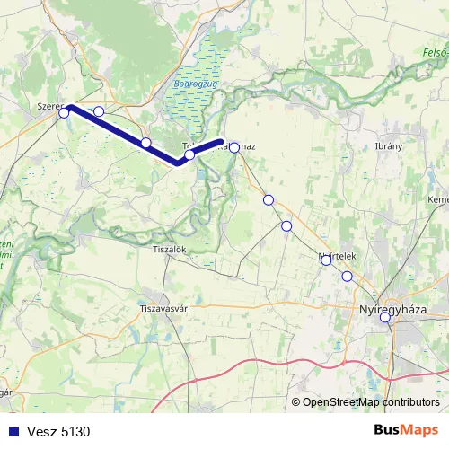 The first stop of the Vesz 5130 rail route is Szerencs and the last stop is Nyíregyháza. Vesz 5130 is operational during everyday.