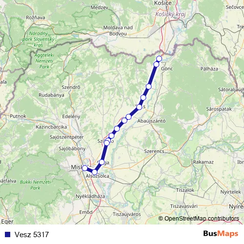 The first stop of the Vesz 5317 rail route is Hidasnémeti and the last stop is Miskolc-Tiszai. Vesz 5317 is operational during everyday.