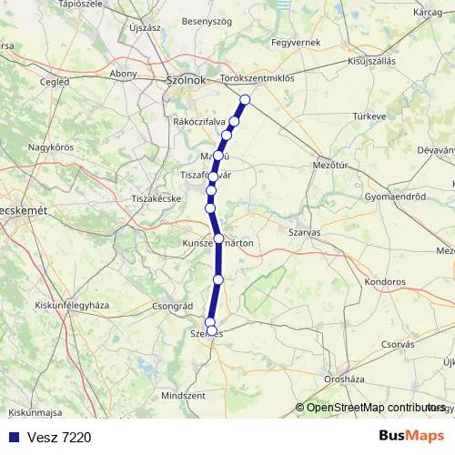 The first stop of the Vesz 7220 rail route is Tiszatenyő and the last stop is Szentes. Vesz 7220 is operational during on weekdays.