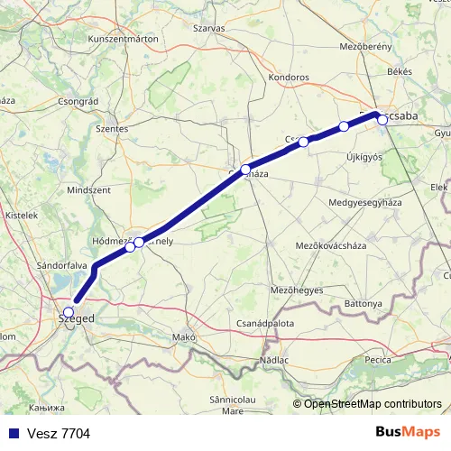 The first stop of the Vesz 7704 rail route is Szeged-Rókus and the last stop is Békéscsaba. Vesz 7704 is operational during on weekdays.