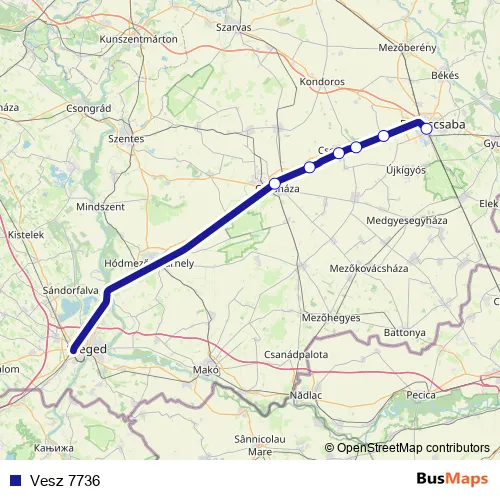 The first stop of the Vesz 7736 rail route is Orosháza and the last stop is Békéscsaba. Vesz 7736 is operational during everyday.