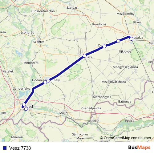 The first stop of the Vesz 7738 rail route is Szeged and the last stop is Békéscsaba. Vesz 7738 is operational during everyday.