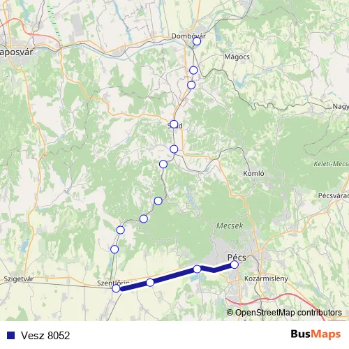 The first stop of the Vesz 8052 rail route is Dombóvár and the last stop is Pécs. Vesz 8052 is operational during everyday.