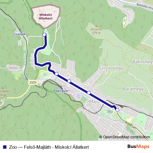 The first stop of the Zoo bus route is Felső-Majláth and the last stop is Miskolci Állatkert. Zoo (Felső-Majláth - Miskolci Állatkert) is operational during everyday.