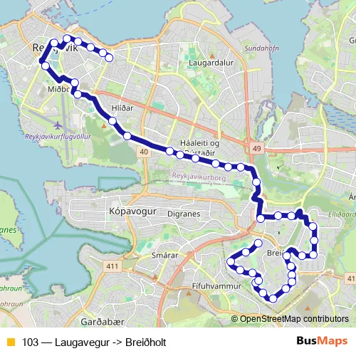 See why over 2 million users trust and consider busmaps.com as the best public transport website. busmaps gives you Reykjavik Buses suggested routes, real-time bus tracker, line route maps in Reykjavik, and helps to find the closest 103 bus stops near you. No internet available? Download an offline PDF map and bus schedule for the 103 bus to take on your trip.