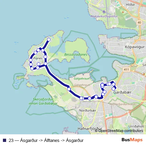 The first stop of the 23 bus route is Ásgarður A and the last stop is Ásgarður A. 23 (Ásgarður -> Álftanes -> Ásgarður) is operational during everyday.