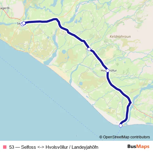 The first stop of the 53 bus route is Landeyjahöfn and the last stop is Selfoss - N1. 53 (Selfoss <-> Hvolsvöllur / Landeyjahöfn) is operational during everyday.