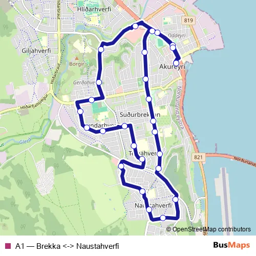 The first stop of the A1 bus route is Miðbær and the last stop is Miðbær. A1 (Brekka <-> Naustahverfi) is operational during on weekdays.