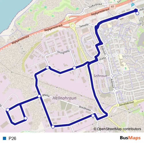 The first stop of the P26 bus route is Ásvallalaug D and the last stop is Ásvallalaug D. P26 is operational during on weekdays.