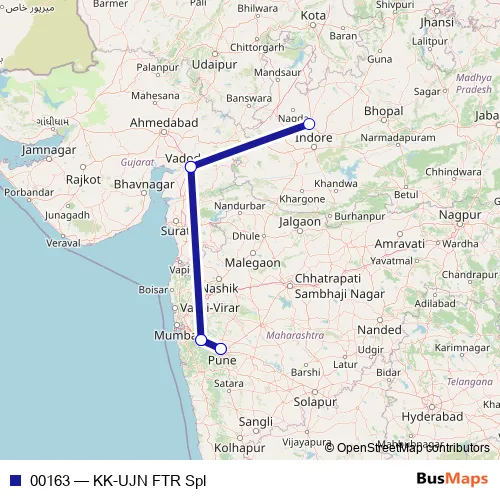 The first stop of the 00163 rail route is Khadki and the last stop is Khadki. 00163 (KK-UJN FTR Spl) is operational during everyday.
