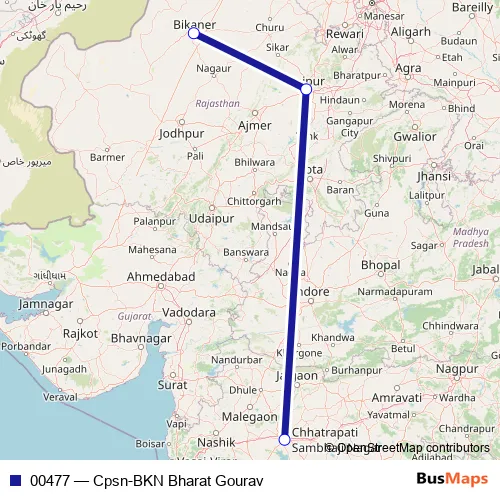 The first stop of the 00477 rail route is Chhatrapati Sambhajinagar and the last stop is Bikaner Jn. 00477 (Cpsn-BKN Bharat Gourav) is operational during everyday.