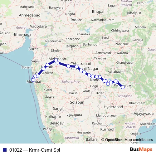 The first stop of the 01022 rail route is Karimnagar Oa and the last stop is C Shivaji MAH T. 01022 (Krmr-Csmt Spl) is operational during everyday.