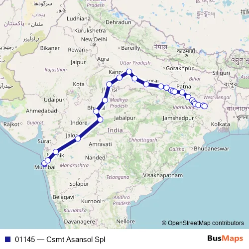 The first stop of the 01145 rail route is C Shivaji MAH T and the last stop is Asansol Jn.. 01145 (Csmt Asansol Spl) is operational during everyday.