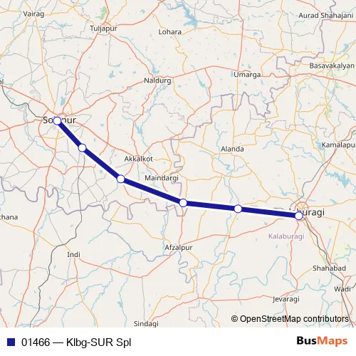 The first stop of the 01466 rail route is Kalaburagi and the last stop is Solapur Jn. 01466 (Klbg-SUR Spl) is operational during everyday.