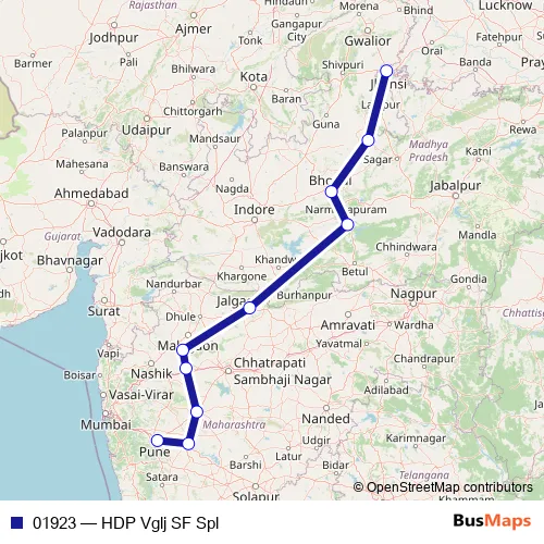 The first stop of the 01923 rail route is Hadapsar and the last stop is Virangana Lakshmibai Jhansi Jn. 01923 (HDP Vglj SF Spl) is operational during everyday.