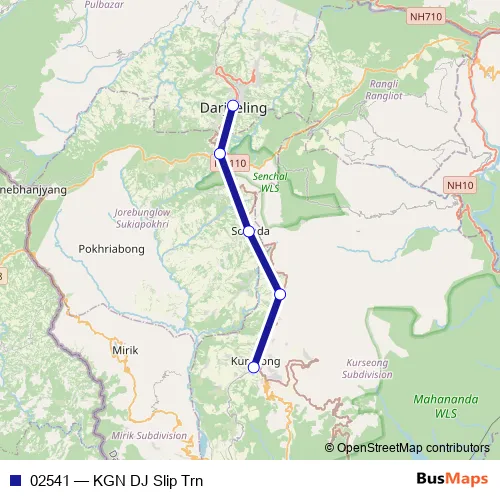 The first stop of the 02541 rail route is Kurseong and the last stop is Darjeeling. 02541 (KGN DJ Slip Trn) is operational during everyday.