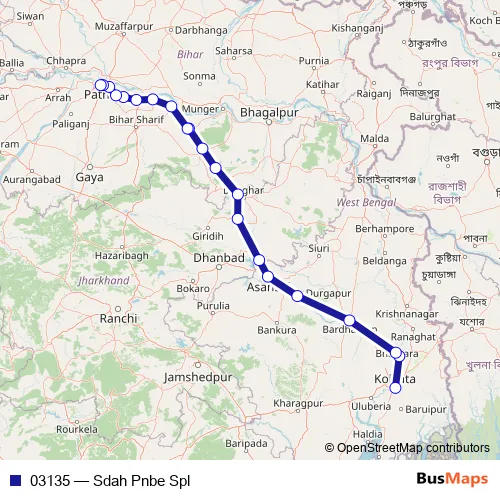 The first stop of the 03135 rail route is Sealdah and the last stop is Patna Jn. 03135 (Sdah Pnbe Spl) is operational during everyday.