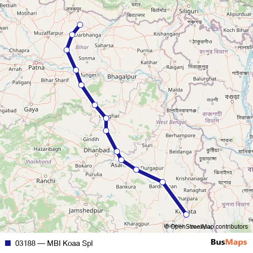 The first stop of the 03188 rail route is Madhubani and the last stop is Kolkatta Terminal. 03188 (MBI Koaa Spl) is operational during everyday.