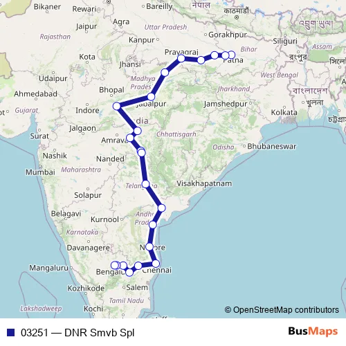 The first stop of the 03251 rail route is Danapur and the last stop is Smvt Bengaluru. 03251 (DNR Smvb Spl) is operational during everyday.